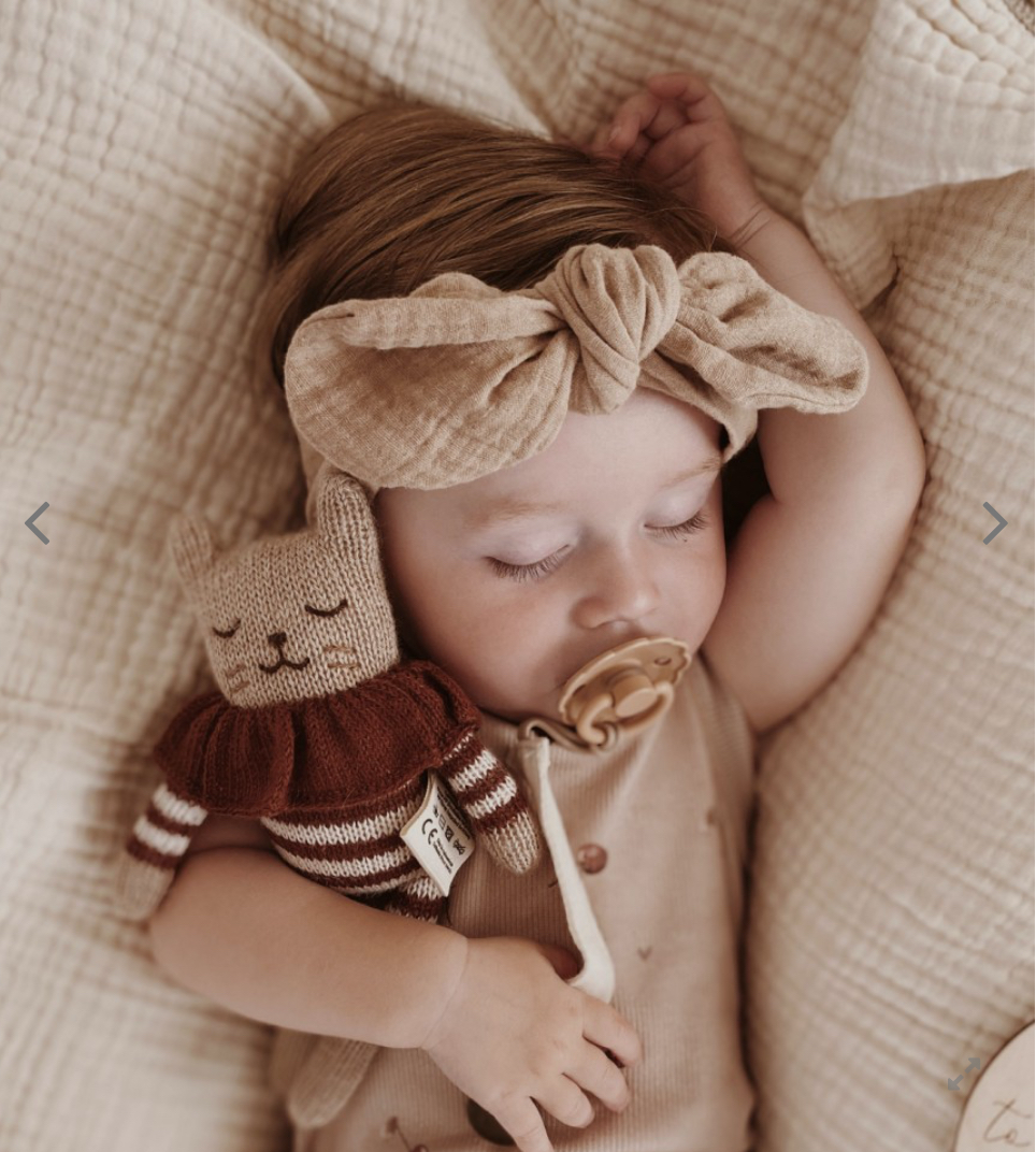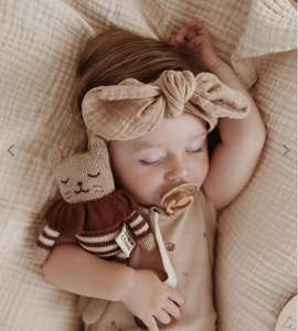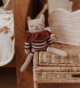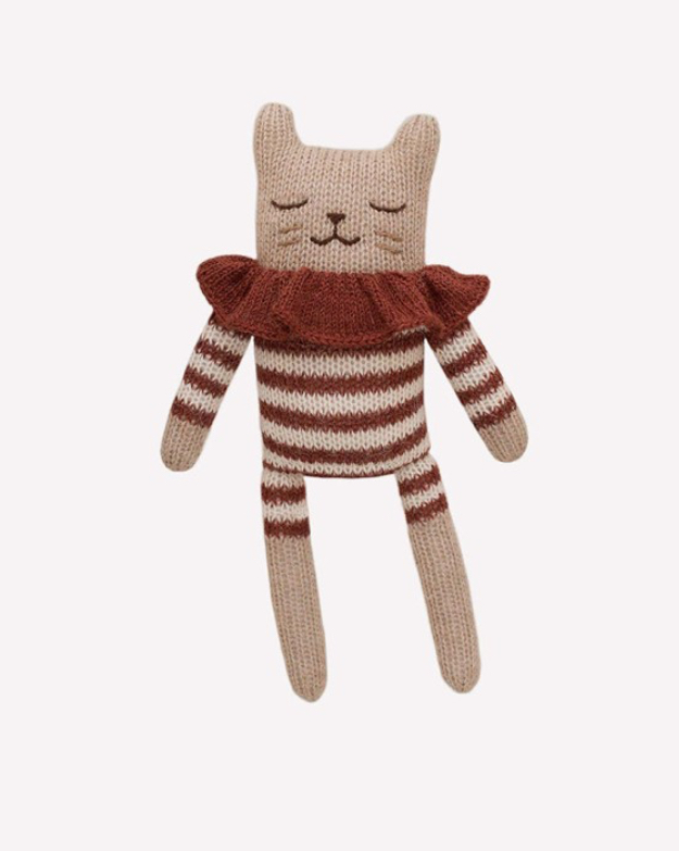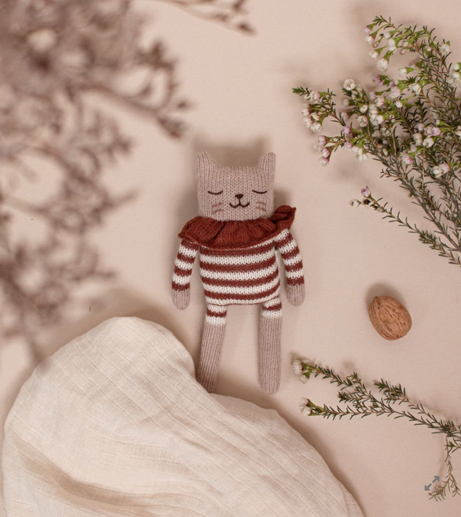 With its striped romper and its cute collar, our kitten soft toy will delight young and old alike! Knitted and embroidered by hand with a lot of attention, it makes a beautiful gift for a birth.