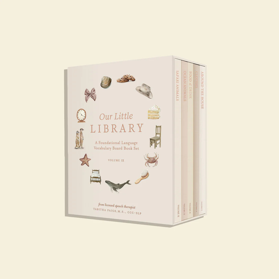 Our Little Library Vol. 2 includes five board books that feature foundational words in the following categories:
