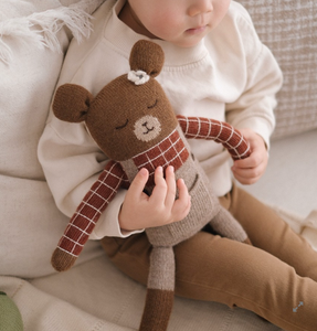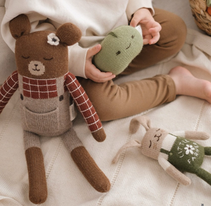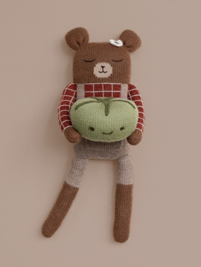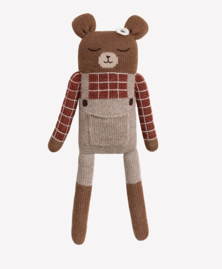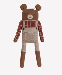 Milo is a big, gentle companion, always up for a walk in nature. With his oat overalls and checkered shirt, he looks just like the perfect little gardener. He even has a tiny knitted pocket, just the right size for keeping a smooth pebble, a golden leaf, or another tiny treasure found along the way. Handmade from 100% baby alpaca wool, he is as soothing as he is snuggly.