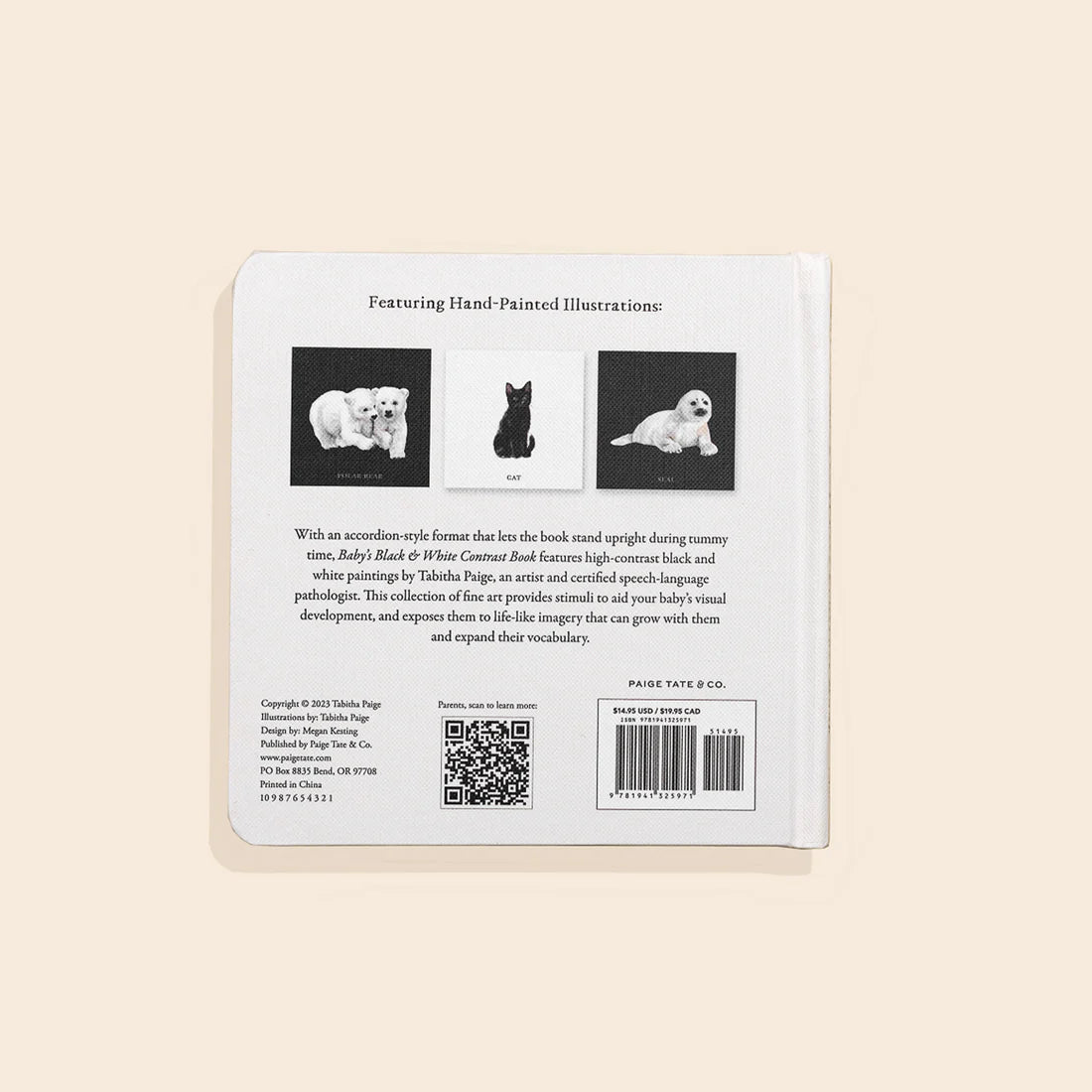 Infants have limited capabilities with vision upon birth and respond well to high-contrast images, which is why this black-and-white contrast book is perfect for their young and growing minds. Baby’s Black and White Contrast Book provides developmentally appropriate visual stimuli for your baby’s visual development, while exposing them to life-like imagery that can grow with them and expand their vocabulary. Each animal painting was designed by Tabitha Paige, artist, speech-pathologist, and author of the bestselling series Our Little Adventures.