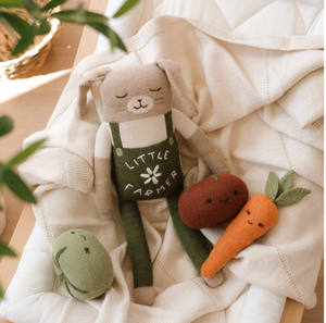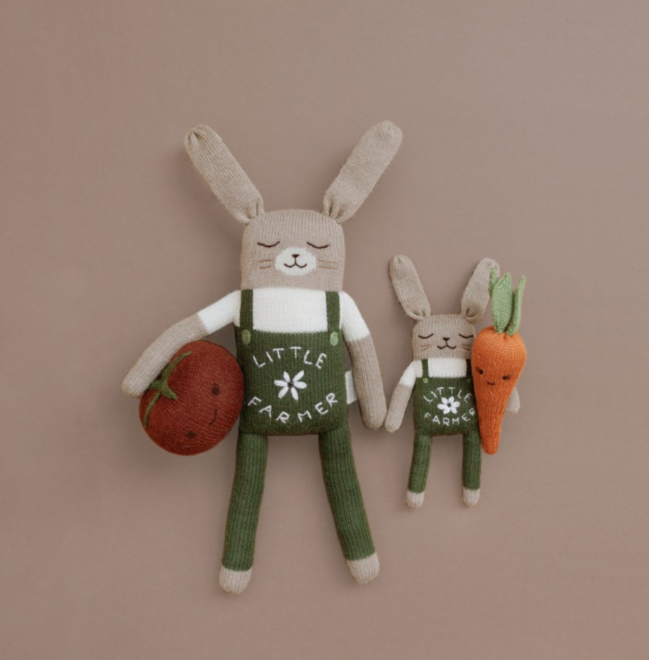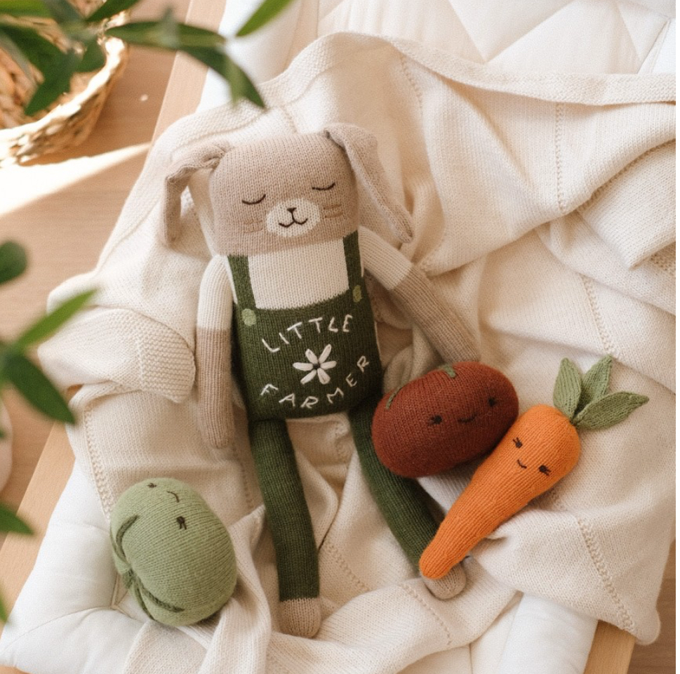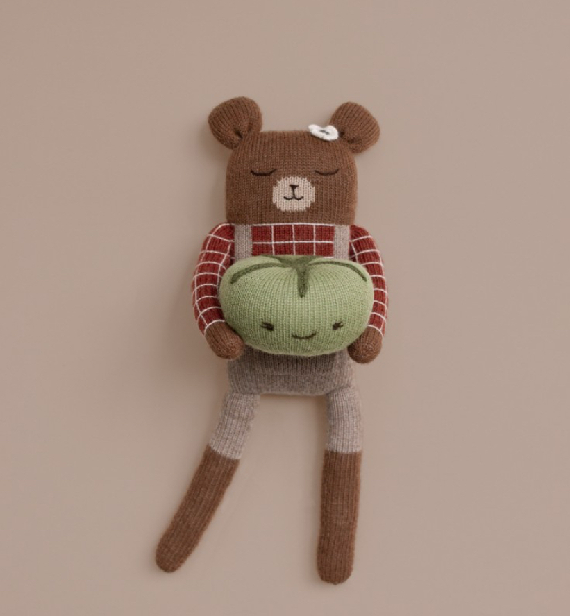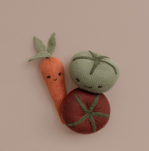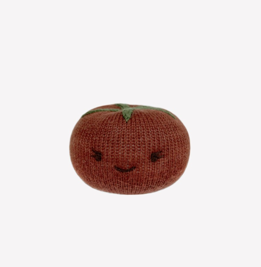 A tiny tomato rattle, inspired by garden treasures. Perfect for awakening the senses, this soft veggie will delight tiny, curious hands. With its gentle jingle and plush texture, it encourages baby’s first discoveries. Hand-knitted from 100% baby alpaca wool, it’s as snuggly as it is charming.